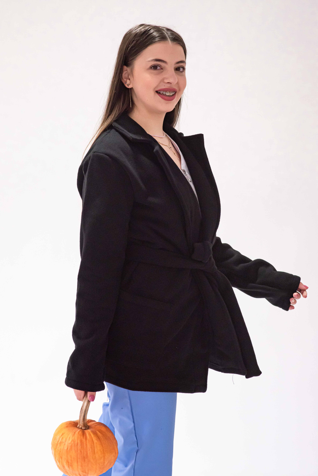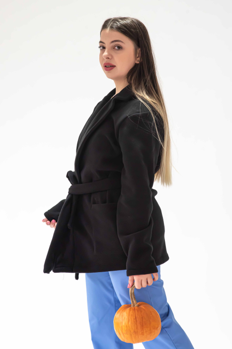 - Are cordon in talie, maneca lunga si 2 buzunare.