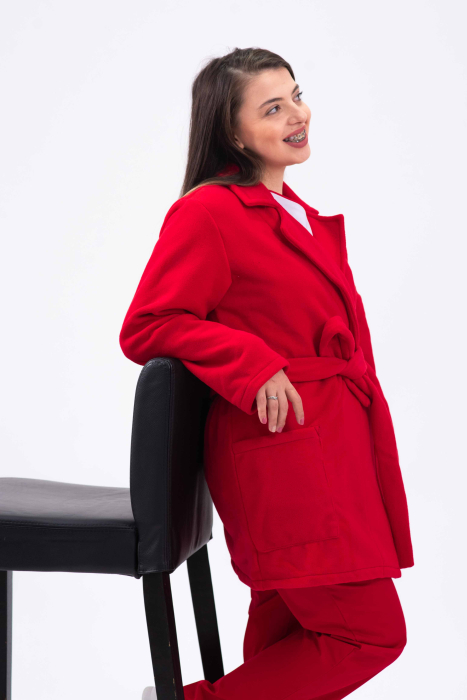 - Are cordon in talie, maneca lunga si 2 buzunare.