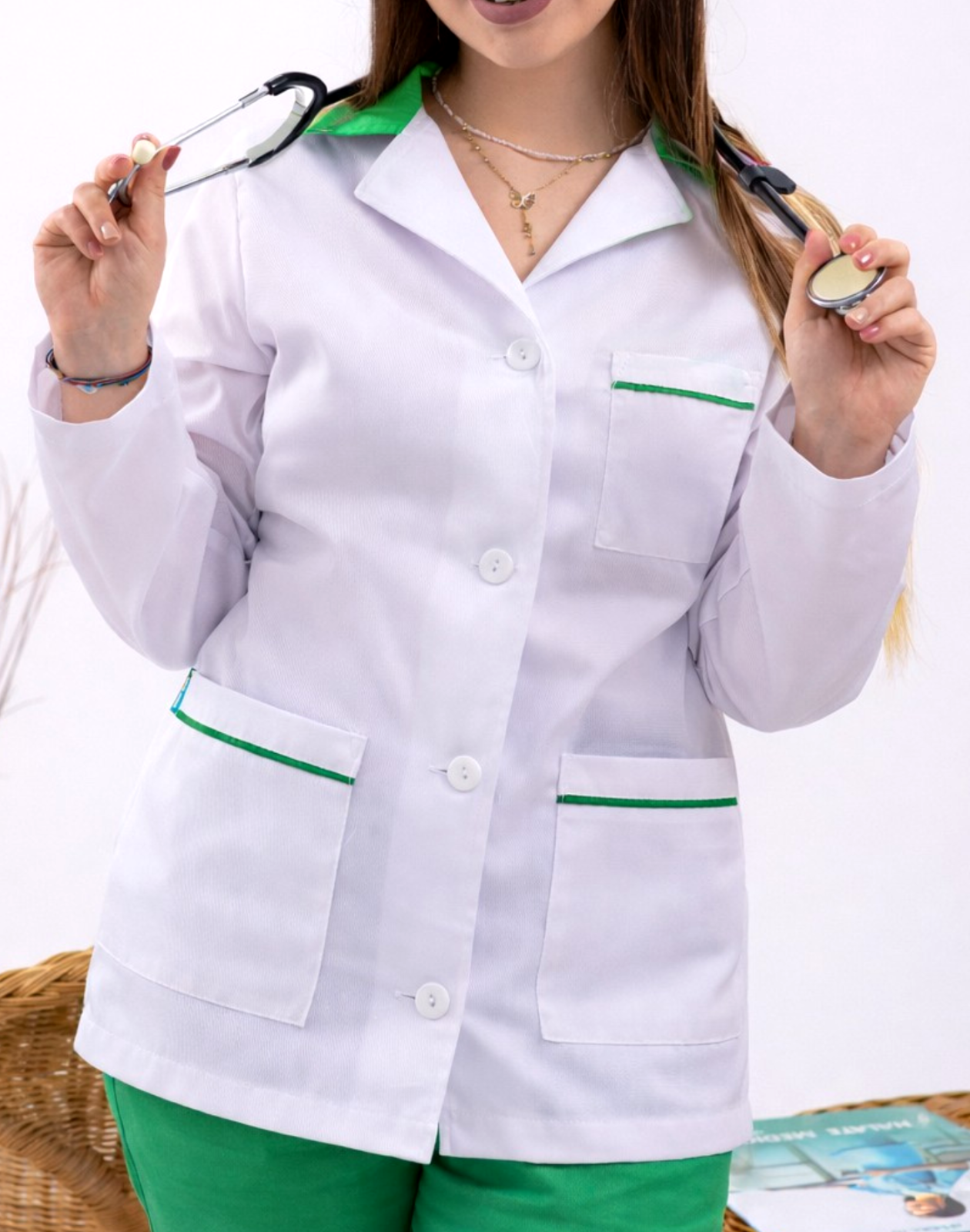 Halat alb scurt, guler verde