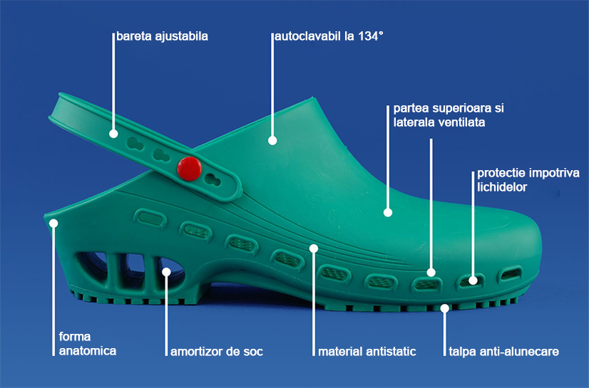Cea mai importanta caracteristica a incaltamintei medicale din cauciuc este ca poate fi sterilizata in autoclave la temperaturi ridicate, pentru curatare si igiena maxima in toate mediile sterile, cum ar fi sala de operatie si terapia intensiva.